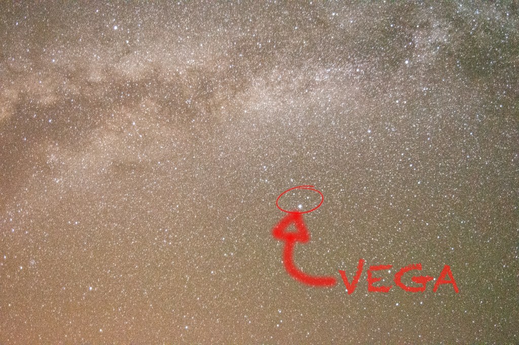 Vega is the 5th brightest star in the night sky, the brightest star in the constellation Lyra. Circled in the photos presented is what is known as the summer triangle; it is made up of the stars Altair, Deneb, and Vega (Vega being the brightest one). Although the name may throw you off, the summer triangle is visible in the northern hemisphere for the vast majority of the year and gets its name from being most visible during summer months. Because of its vast visibility, vega and the summer triangle make a great comparison point for different levels of light pollution.